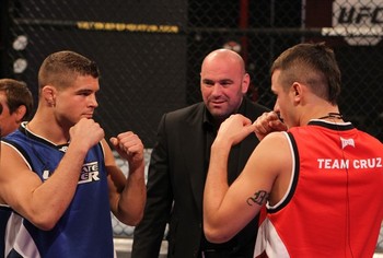 LAS VEGAS, NV – MARCH 23: Team Faber’s Al Iaquinta (L) and Team Cruz’s Myles Jury face off after the announcement of their fight during season fifteen of The Ultimate Fighter at the UFC Training Center on March 23, 2012 in Las Vegas, Nevada. (Photo by Josh Hedges/Zuffa LLC/Zuffa LLC via Getty Images)